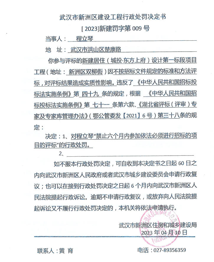 武汉市新洲区建设工程行政处罚决定书[2023]新建罚字第009号