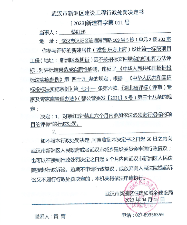 武汉市新洲区建设工程行政处罚决定书[2023]新建罚字第011号
