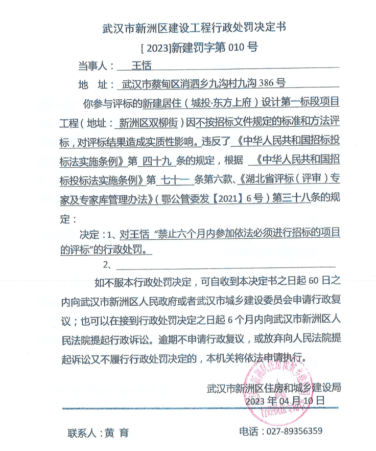 武汉市新洲区建设工程行政处罚决定书[2023]新建罚字第010号