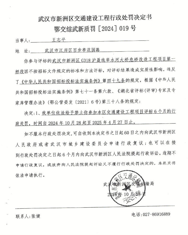 武汉市新洲区交通建设工程行政处罚决定书鄂交综武新质罚[2024]019号