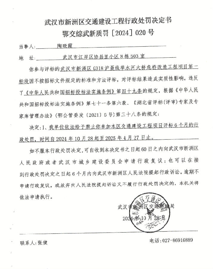 武汉市新洲区交通建设工程行政处罚决定书鄂交综武新质罚[2024]020号