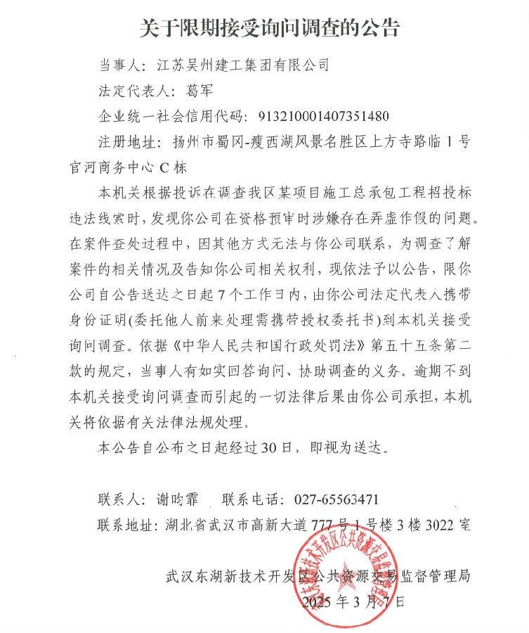 关于限期接受询问调查的公告(江苏吴州建工集团有限公司)