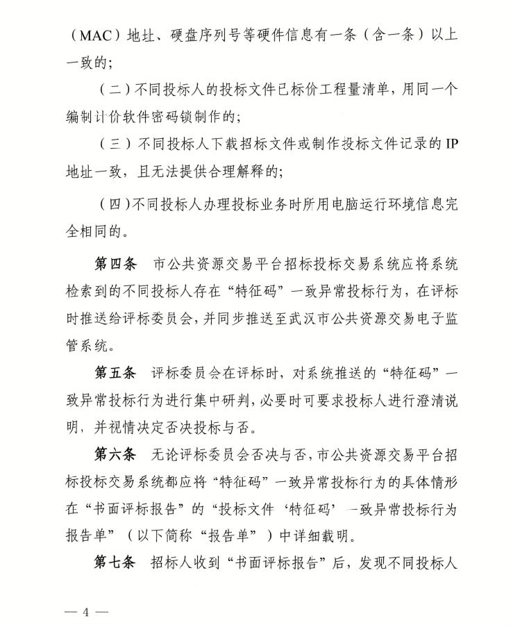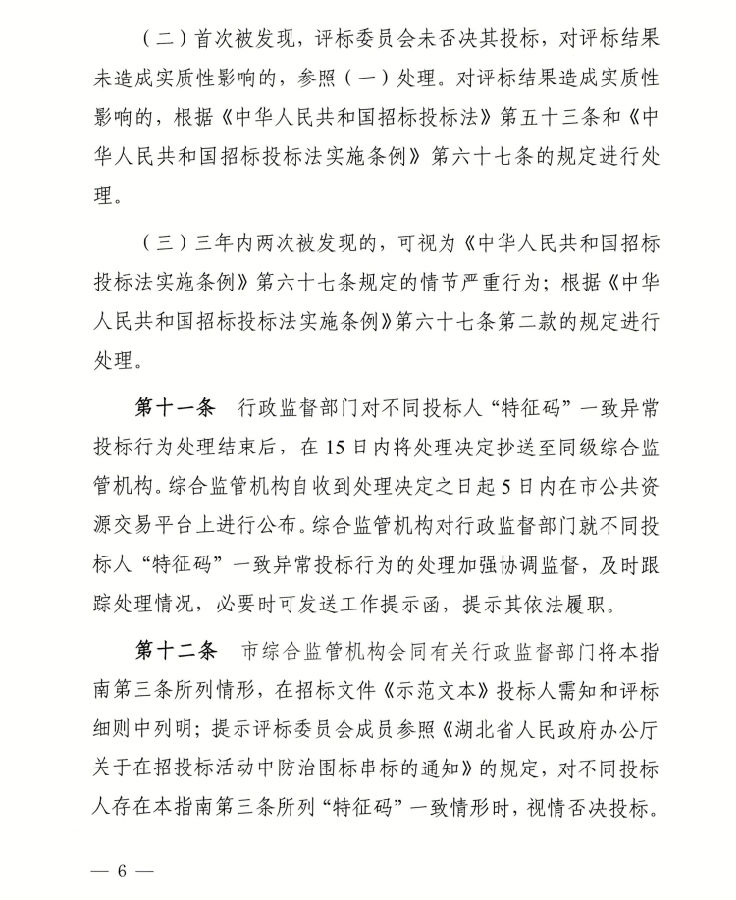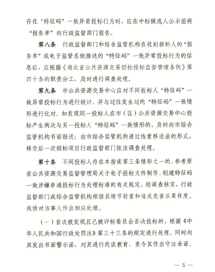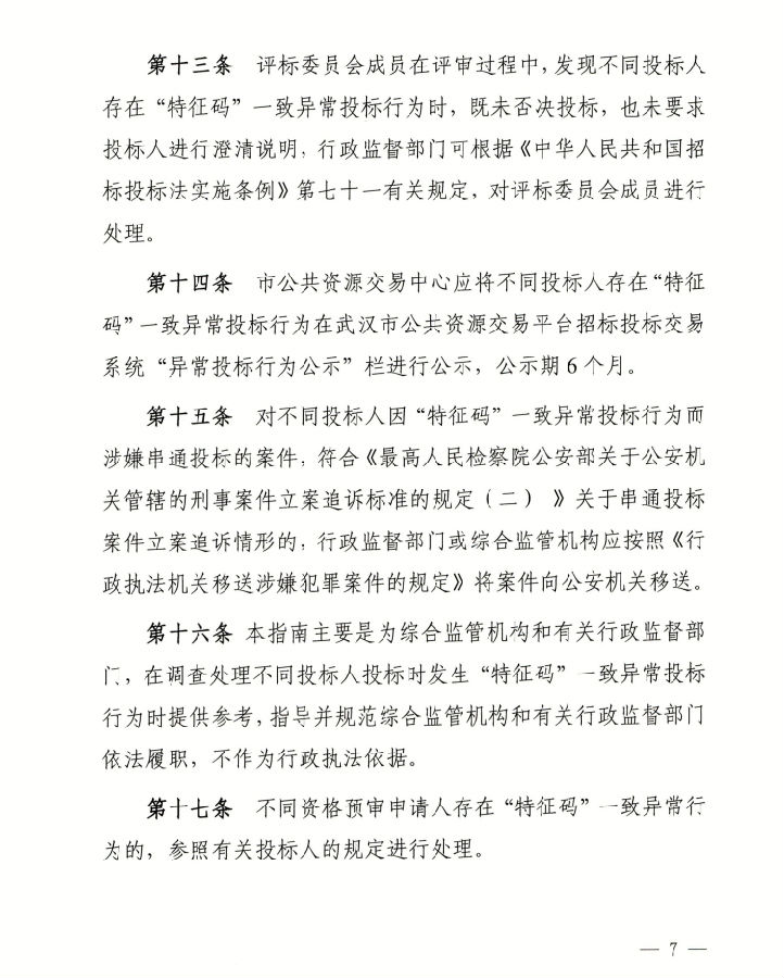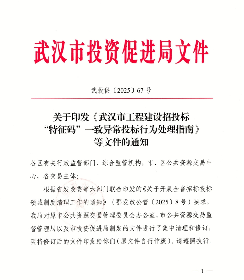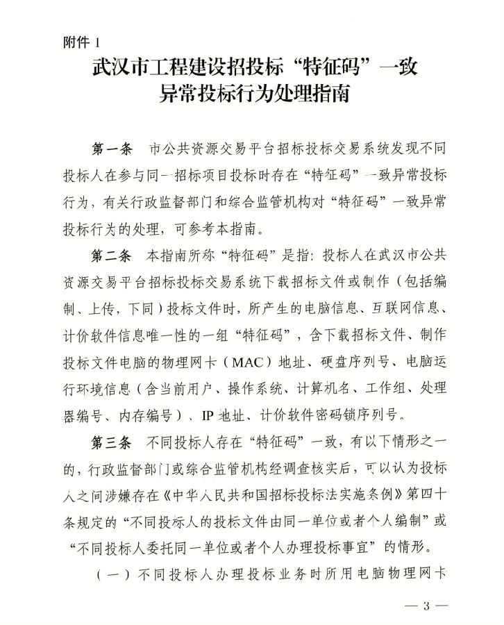 关于印发《武汉市工程建设招投标“特征码”一致异常投标行为处理指南》等文件的通知